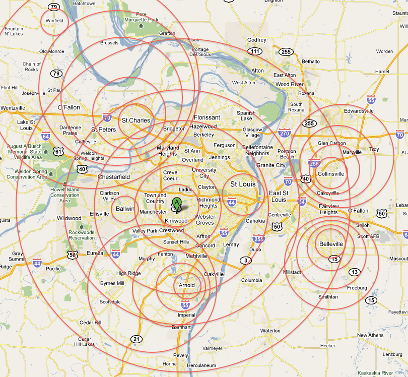 Our members live all over the Saint Louis metropolitan area; which includes Saint Louis City proper, plus the surrounding incoporated and unincorporated municipalities (cities, towns, villages). The areas of highest membership concentration are the first three rings around the A on the map shown below. These rings include Kirkwood/Webster Groves, South County, St. Charles/St. Peters and St. Louis City proper.